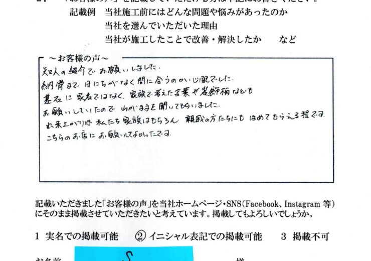 改修 墓石の改修|八千代市 I様とK様(姉妹) お客様の声 私が子供の頃に親からお墓の石が盗まれたと聞かされていました。それも盗んだのが近くの墓の方でした。 お墓の上のものがなくなっていたことがずっと引っかかていました。 石屋さんからこれが宝珠とおしえていただき、本当に宝を取り戻せた気分です。 こんな小さなことを頼んでもいいのか迷いましたが、快く引き受けてくださり、ありがとうござました。 墓地の改修|八千代市 K.K様 新規墓石の建立|八千代市 O様