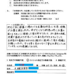 近藤石材店では、まず何よりも「すぐに現地へお伺いすること」を大切にしています。実際の場所や周りの環境を拝見しないと、正確なご提案ができないからです。今回もすぐにお伺いし、k.k様のお気持ちに寄り添いながら、ご家族の皆様がこれからもずっと安心してお参りできるようなご提案をさせていただきました。