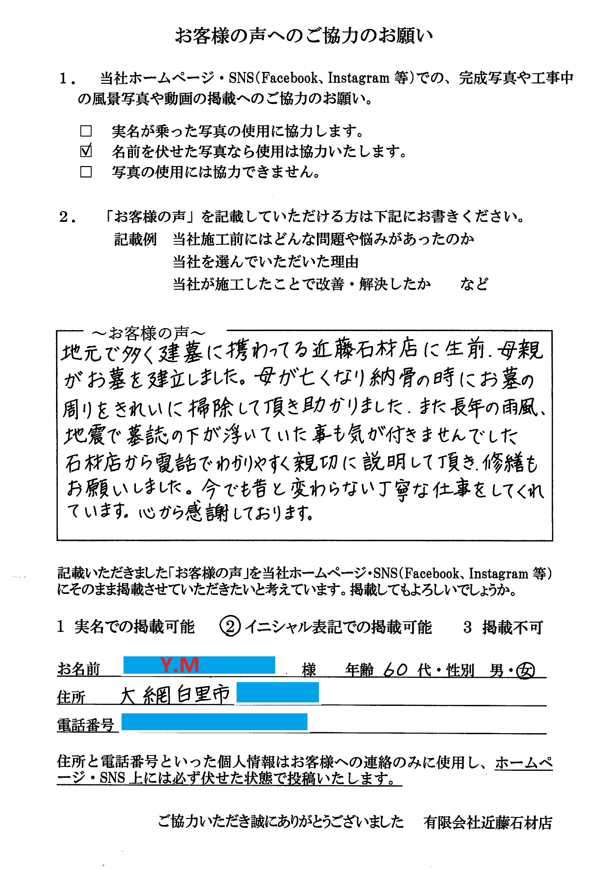 地元で多く建墓に携わってる近藤石材店に生前、母親がお墓を建立しました。母が亡くなり納骨の時にお墓の周りをきれいに掃除して頂き助かりました。また長年の雨風、地震で墓誌の下が浮いていた事も気が付きませんでした石材店から電話でわかりやすく親切に説明して頂き、修繕もお願いしました。今も昔と変わらない丁寧な仕事をしてくれています。心から感謝しております。
